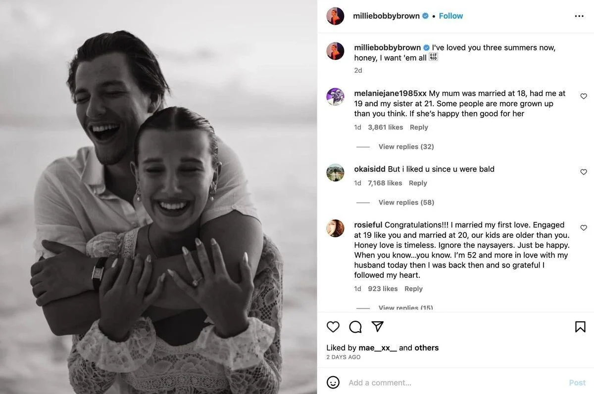 Millie and Jake announced that they started a relationship in November 2021 after being spotted together frequently. Millie later showed off the proposal ring given by Jake on April 11, 2023.